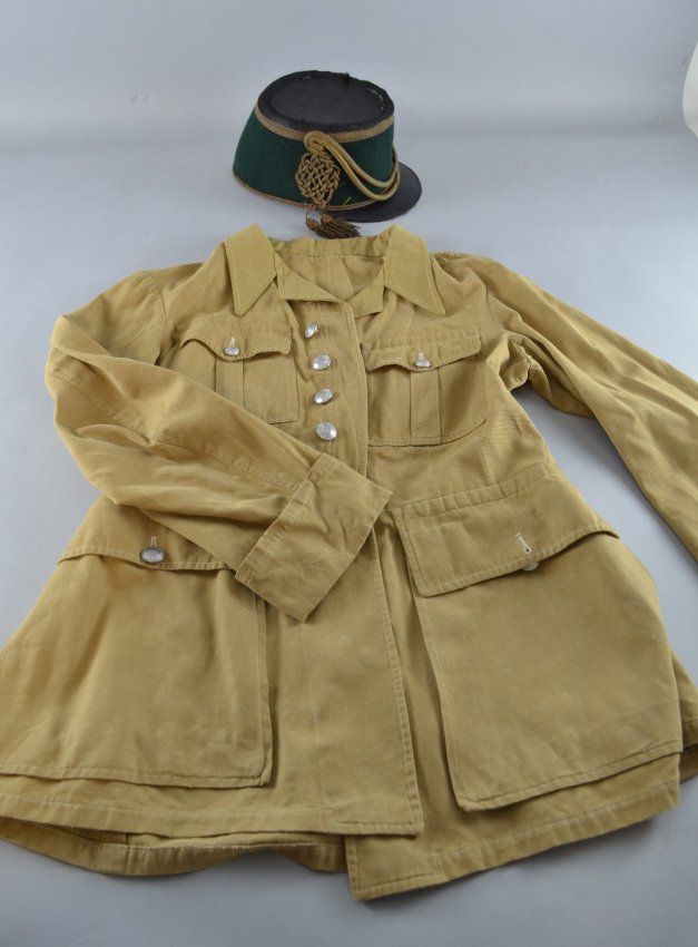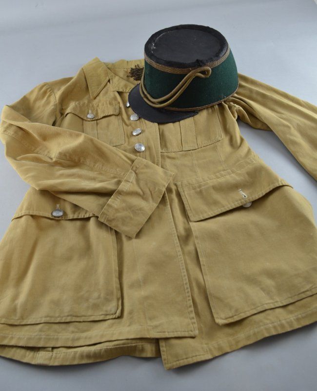A French military canvas jacket, and a green felt shako hat with gilt trim