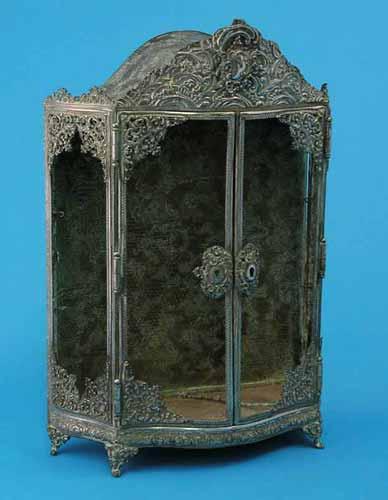 A French plated miniature model of an armoire, decorated throughout with rococo style motifs on scroll feet, lacking glass, 13.5ins £120-180
