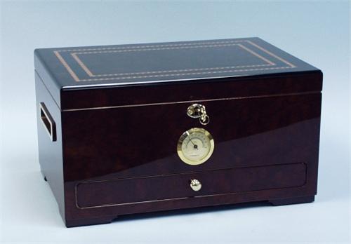 A French polished cigar humidor with border inlay and side handles. Features a hygrometer, one drawer and a large interior. Includes a lock with two keys. 7 1/2" x 13 3/4" x 9 1/4".