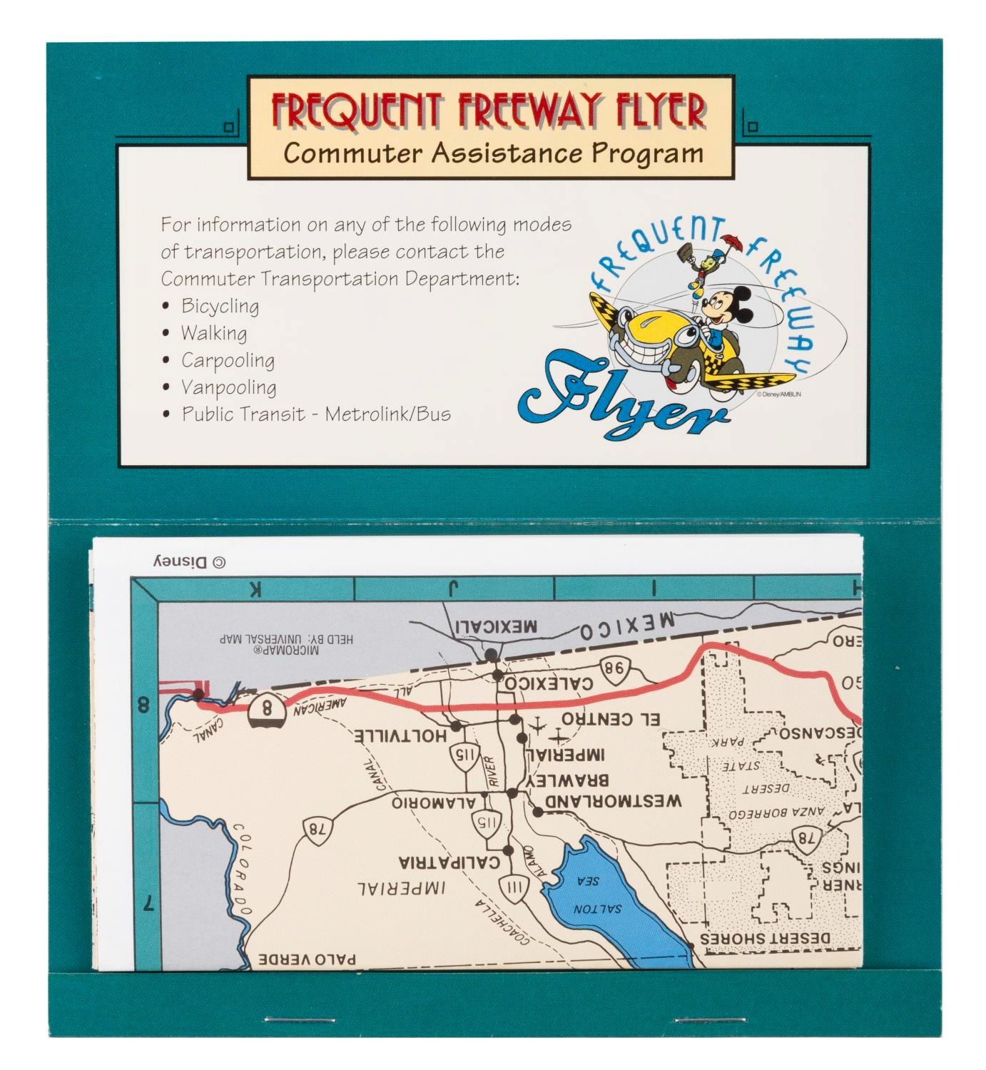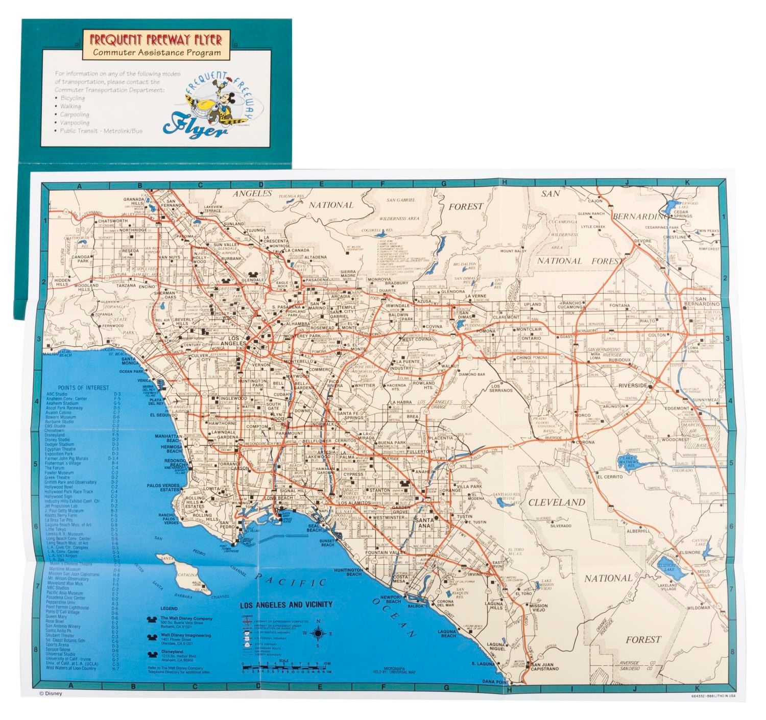 (Disney, 1990s) A Frequent Freeway Flyer Commuter Assistance Program fold-out map of Southern California and Orange County. Measuring 4" x 6.75" folded, the map is in very good condition with light handling wear.