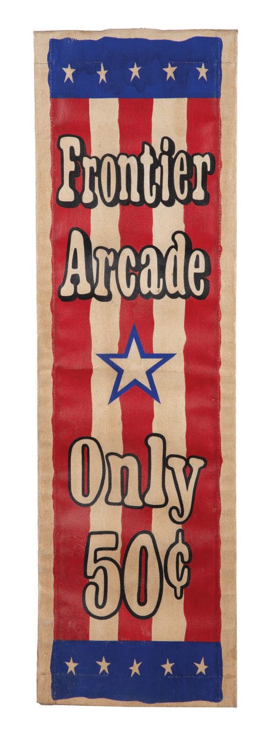 (Disneyland, 2000s) A Frontierland Shooting Arcade Banner Prop. The hand-painted banner advertised the price for a round of electronic "ammunition" with a star-spangled motif. Measuring 10.5"x34.75", the banner displays in very good condition, exhibiting the slightest wear from Park display.