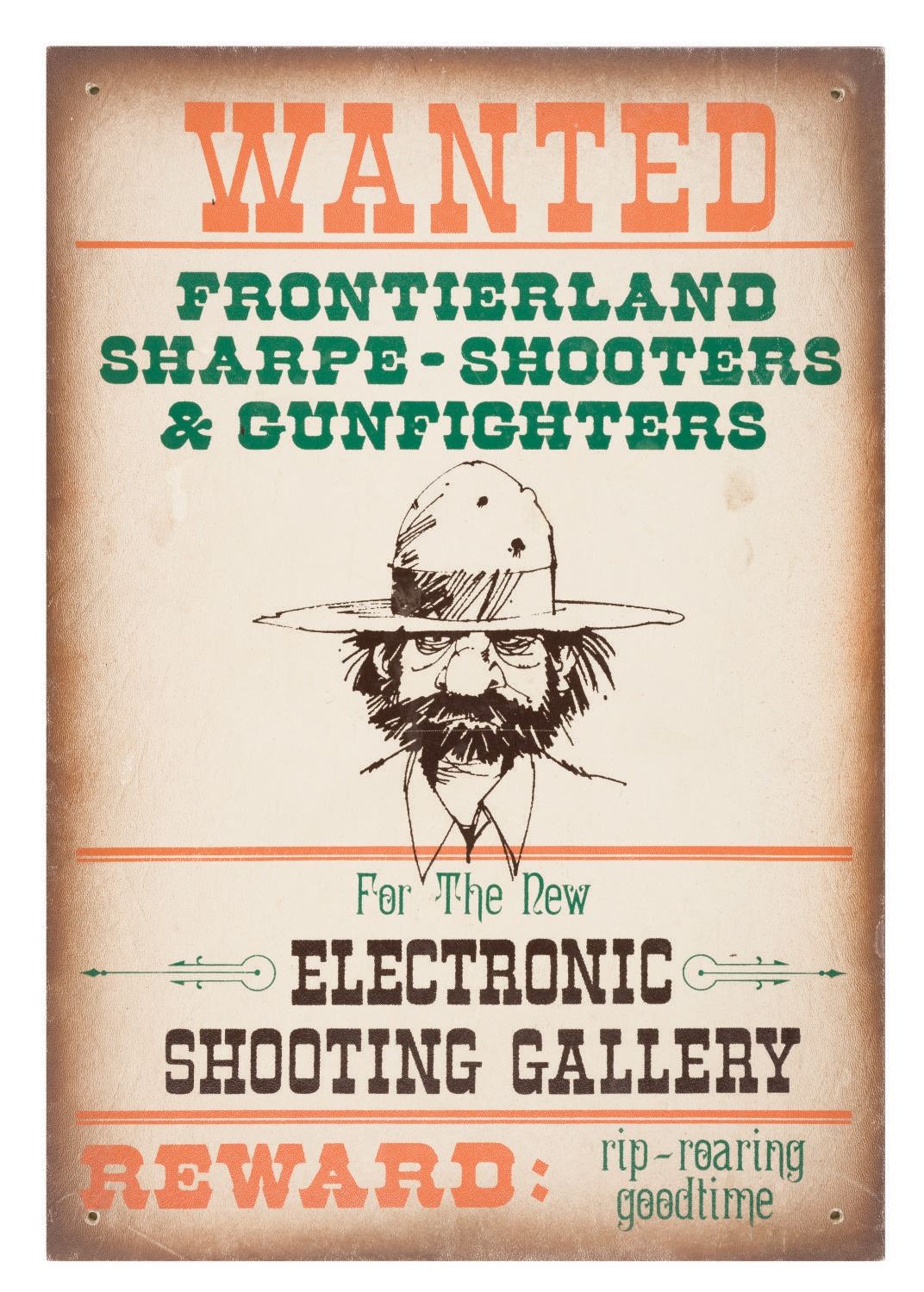(Disneyland, 1980s) A Frontierland Electronic Shooting Gallery Sign. The Frontierland Shooting Gallery exchanged pellet rifles for electric guns in 1976 and changed its name to Frontier Shootin' Arcade in 1988. Measuring 13"x18.75", the heavy acrylic sign is in good condition with adhesive retention on reverse from original mounting, scuffs, scratches, and wear from Park display and age.
