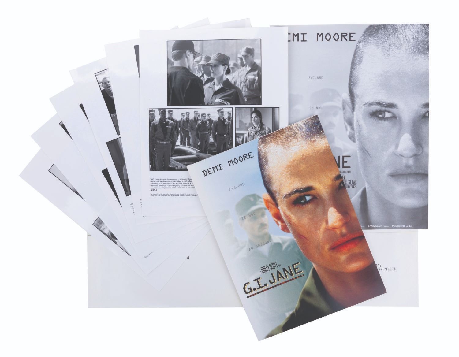 (Hollywood Pictures, 1997) A baseball hat and press kit for Ridley Scott’s “G.I. Jane,” starring Demi Moore. Included in the press kit are six publicity stills, a production book, and premiere program. Ranging in size from the one size fits most hat to the 9” x 12” folder, the items are in good to fine condition with stains on the folder and a footprint on one photo.