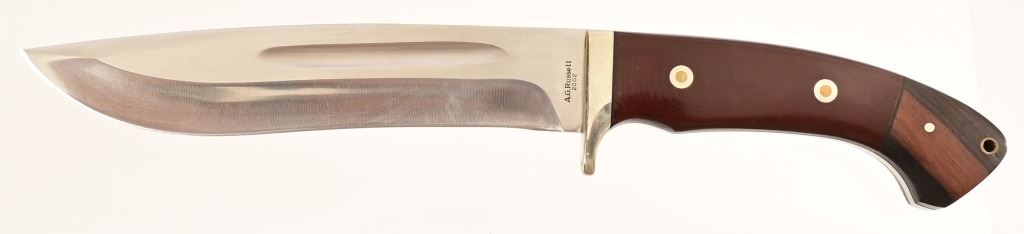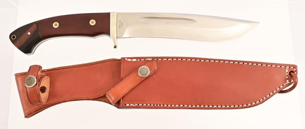 8" drop-point blade, made with AUS-8 Japanese stainless steel, micarta & wood hybrid grips with black liner. 13.75" overall length. Custom leather sheath.