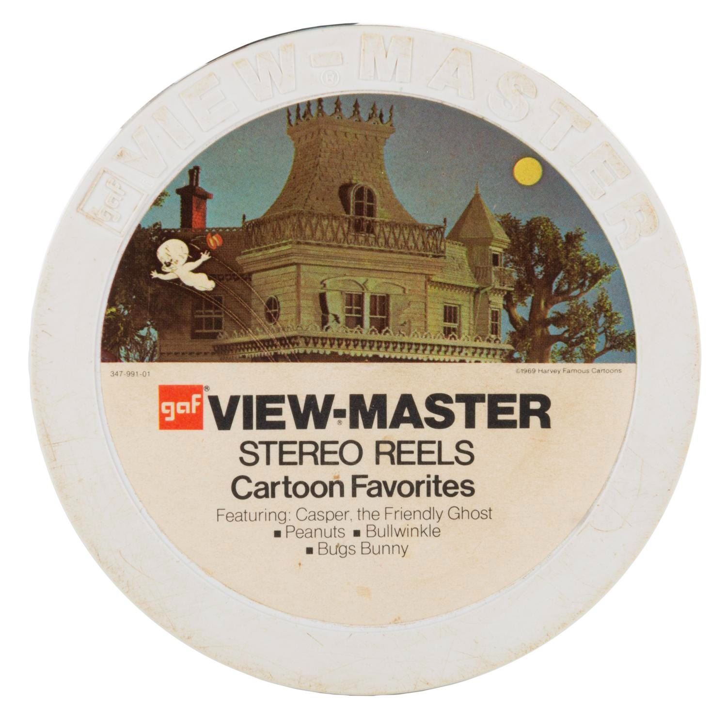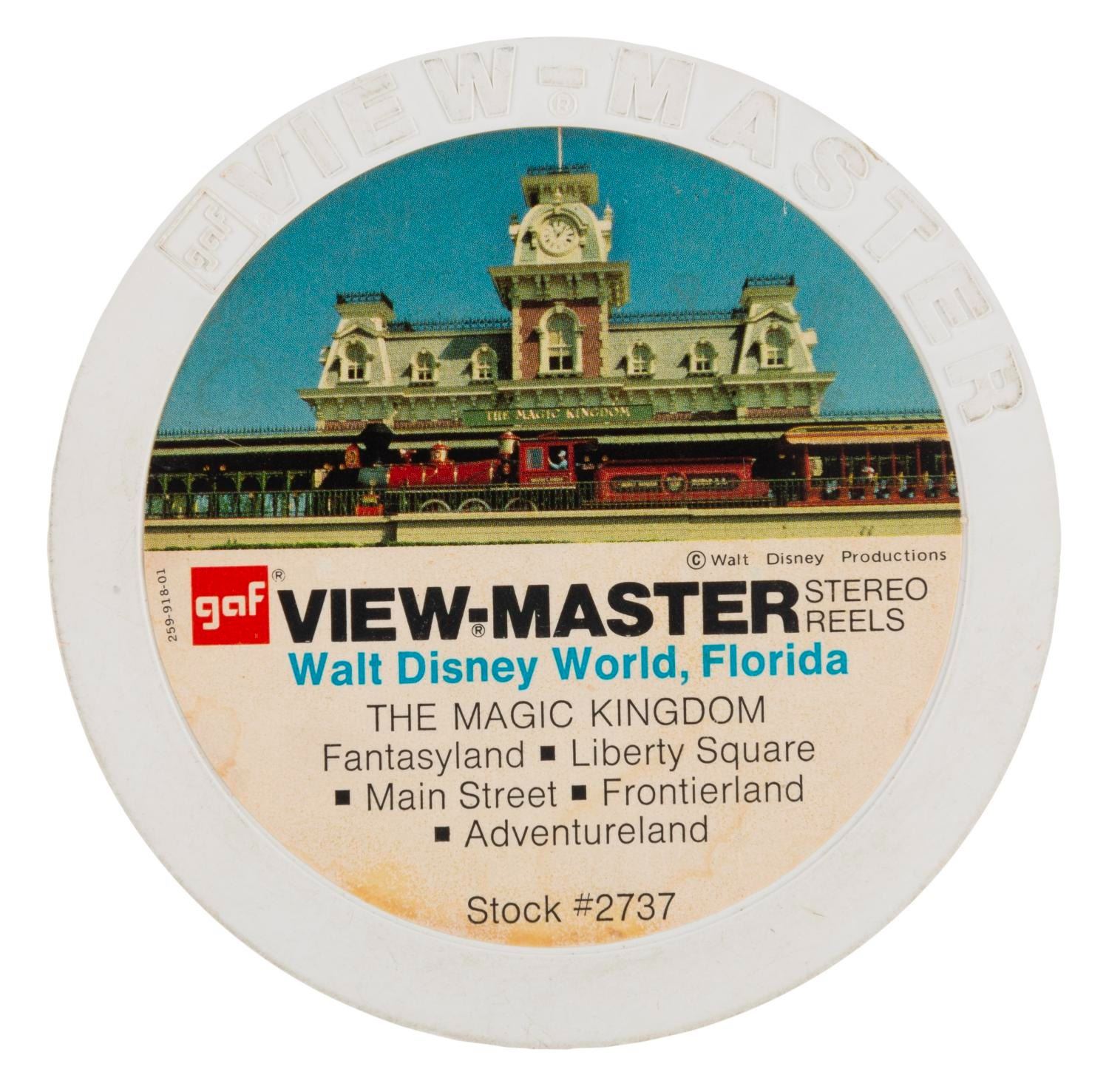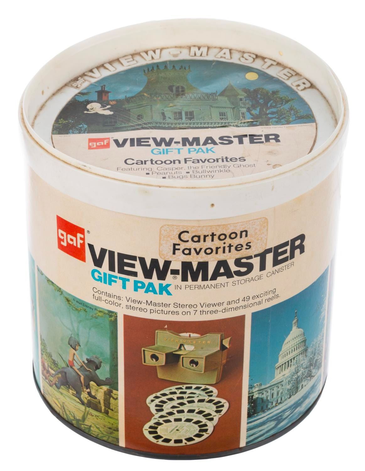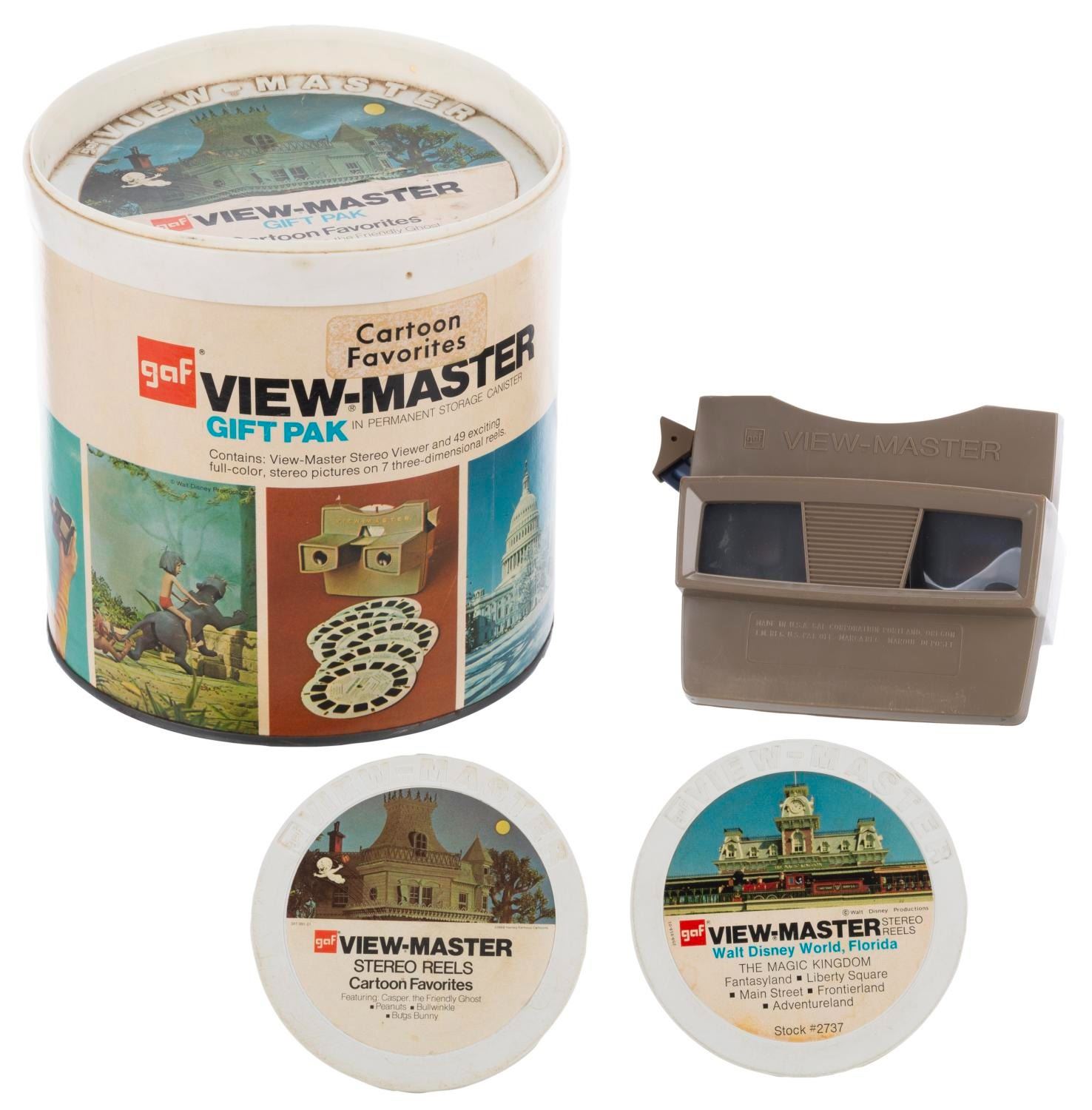 (GAF, 1970s) A GAF Viewmaster Gift Pak set including Walt Disney World and Cartoon Favorites Reels. Walt Disney World reels include Fantasyland, Liberty Square, Main Street, and Adventureland. Cartoon Favorites reels include The Hardy Boys, Woody Woodpecker, Superman, Bullwinkle, Bugs Bunny, Casper, and Peanuts. The Viewmaster and reels are in fair condition, with one eye diffuser pushed in on the Viewmaster and heavy wear from use to the reels. The original 6” x 6” box is in fair condition with discoloration and curled edges.