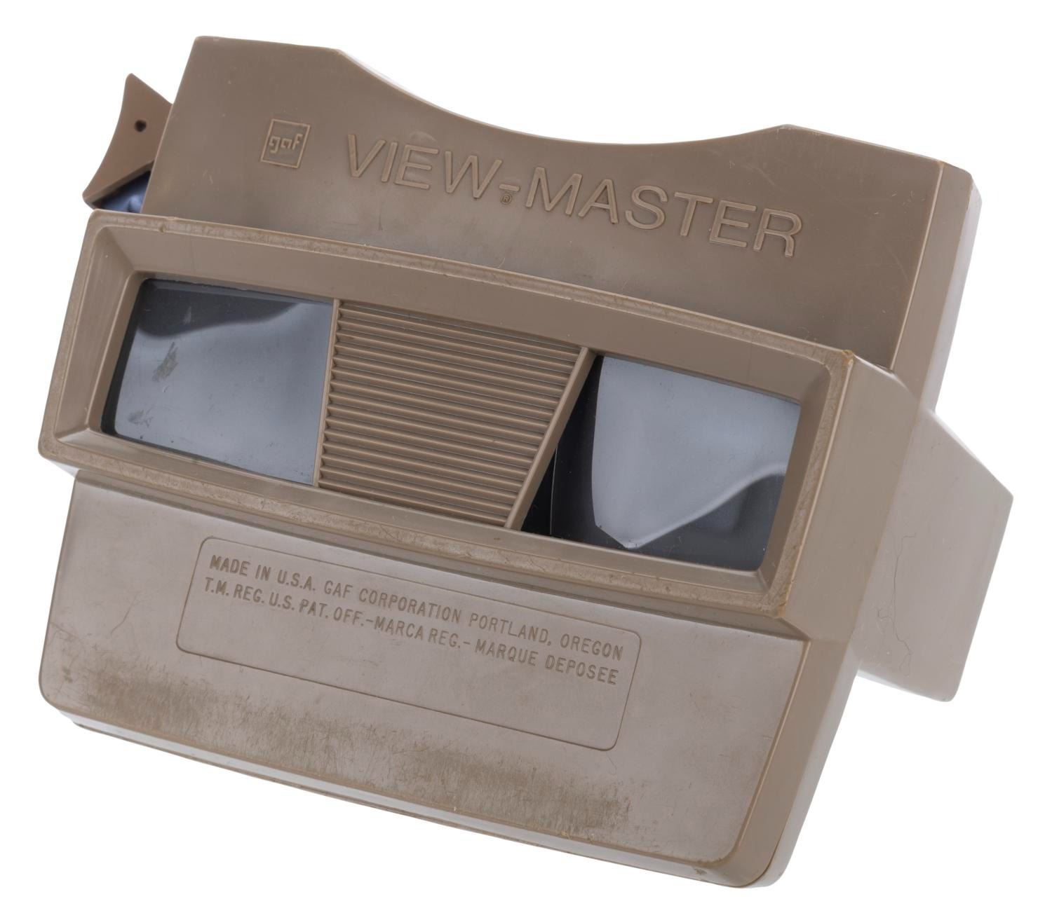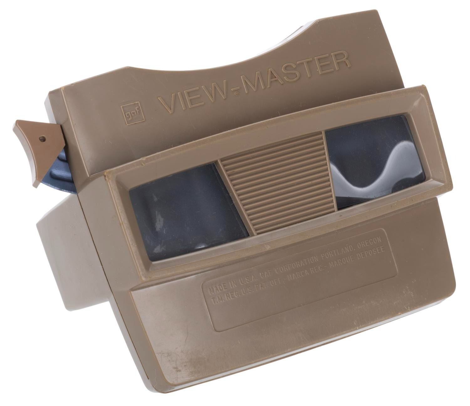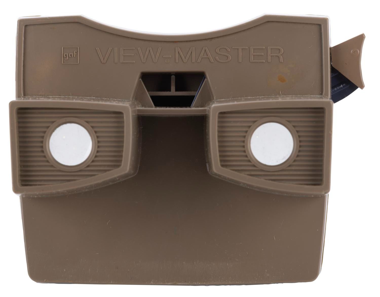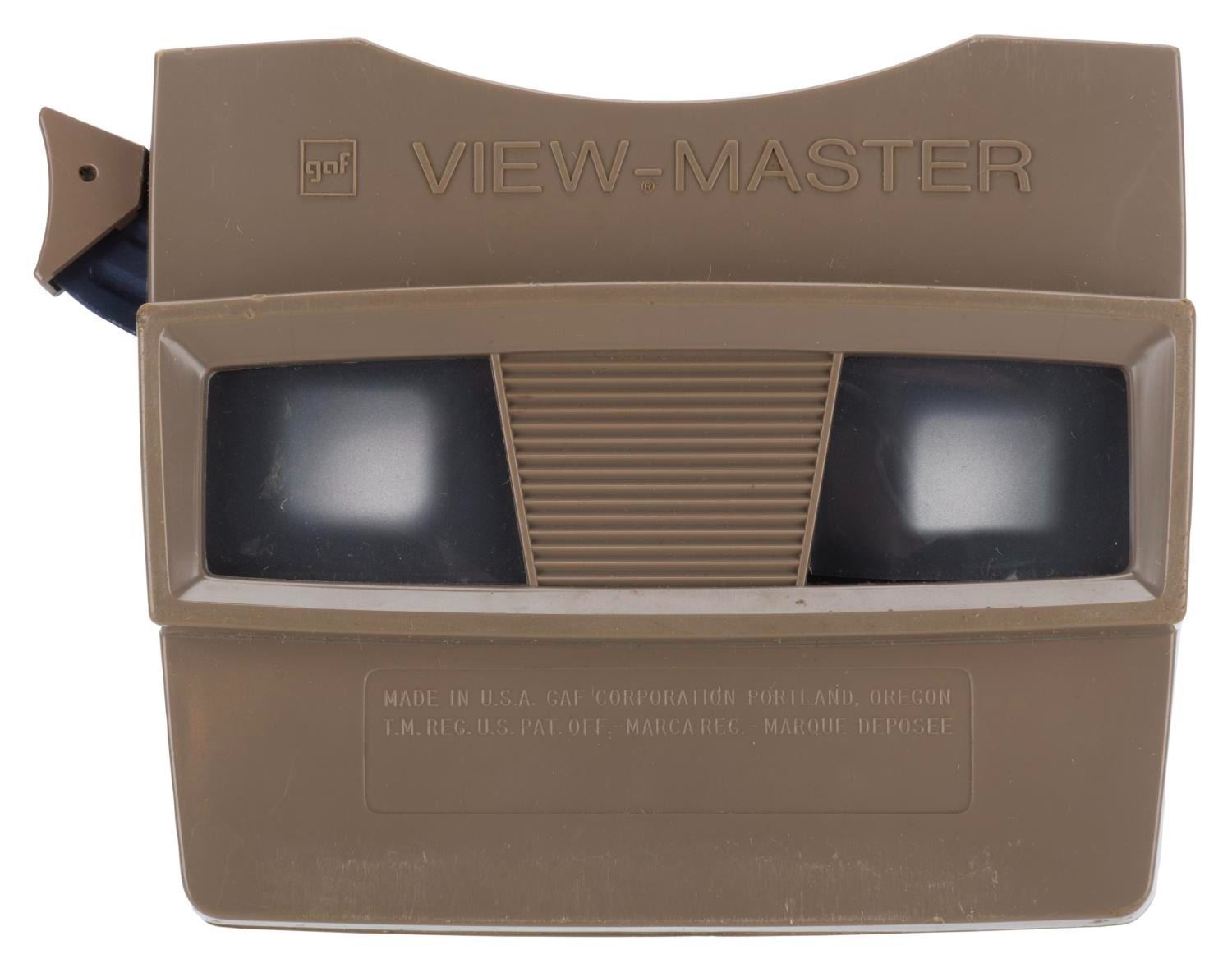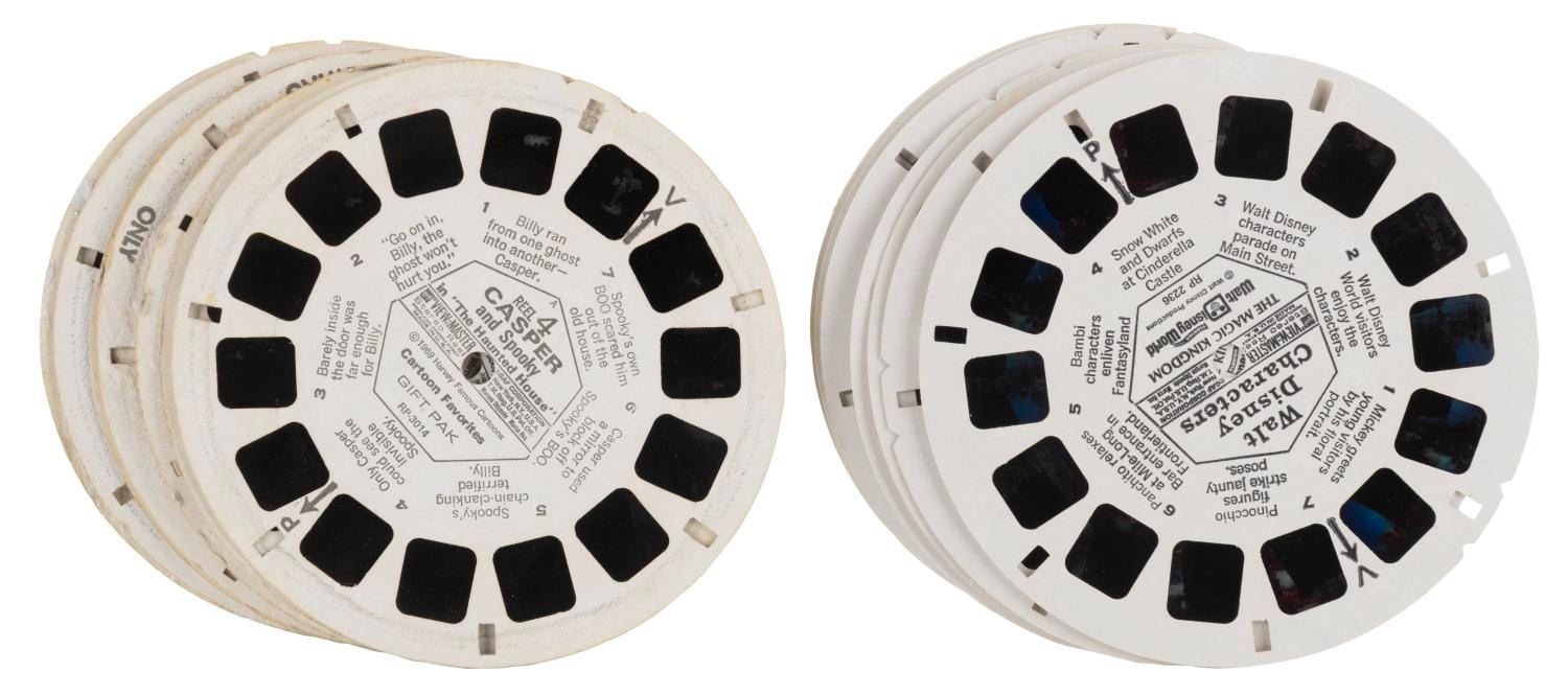 (GAF, 1970s) A GAF Viewmaster Gift Pak set including Walt Disney World and Cartoon Favorites Reels. Walt Disney World reels include Fantasyland, Liberty Square, Main Street, and Adventureland. Cartoon Favorites reels include The Hardy Boys, Woody Woodpecker, Superman, Bullwinkle, Bugs Bunny, Casper, and Peanuts. The Viewmaster and reels are in fair condition, with one eye diffuser pushed in on the Viewmaster and heavy wear from use to the reels. The original 6” x 6” box is in fair condition with discoloration and curled edges.
