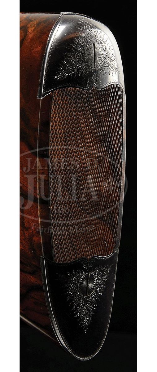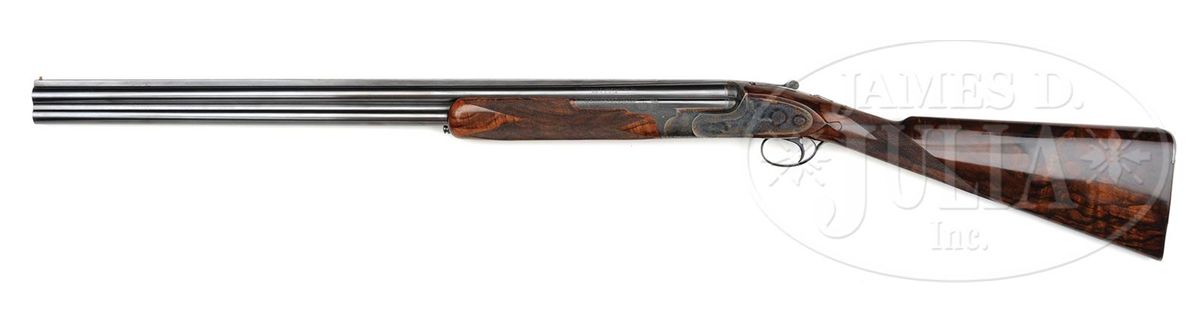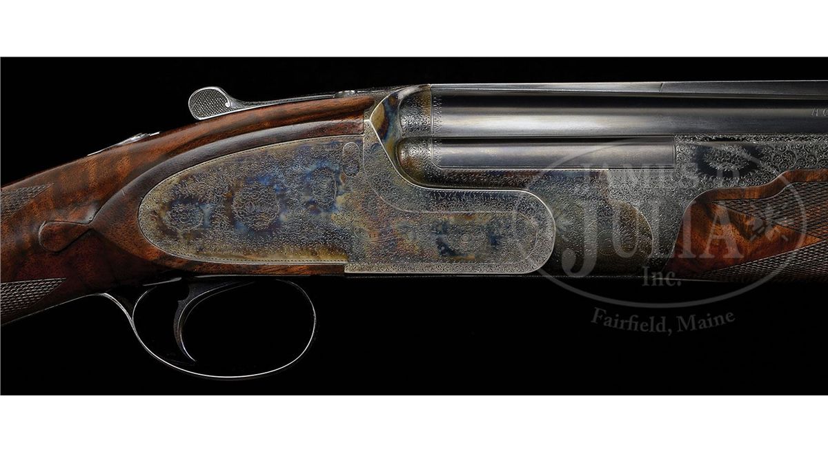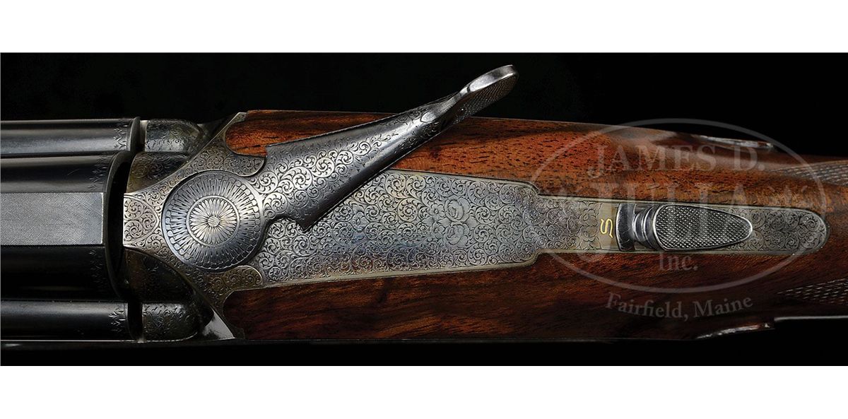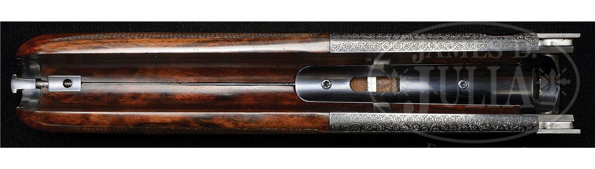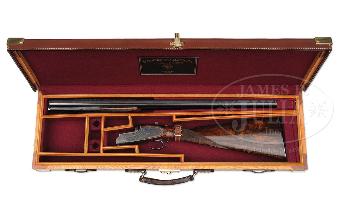 SN G113. Cal. 12 ga. 2-3/4" Chambers. This exceptional and innovative American made gun, embodying style and grace of the classic Boss O/U, has 28" demi-bloc bbls with raised, matted, solid rib engraved "A. Galazan" on top right, and "Connecticut Shotgun Mfg. Co" and "N. B. Ct. U. S. A." on left. Flat of bottom bbl is engraved with SN and gauge. Case hardened, low profile, full sidelock, O/U action features non-automatic safety, intercepting sears, and single non-selective trigger. It is fitted with Galazan's simplified and well engineered pinless sidelocks with single mounting screws, undetectable under small hinged covers, that blend almost perfectly with lockplates. Action is beautifully filed and polished, and engraved with classic hand cut small scroll with rose bouquet highlights in Boss style. "GALAZAN" is in scroll terminated riband on each lockplate. This fine engraving is by "Creative Art" with signature on trigger plate. Small bow beaded trigger guard is also scroll engraved, and has SN gold inlaid at grip. Exceptionally fine, intricately marbled, and nicely figured European walnut straight grip buttstock features drop points, as well as borderless point pattern checkering at grip, and measures 14-3/4" over checkered wood butt with engraved blued steel heel and toe plates. Matching Boss inspired ejector forend has Anson type release. Bore diameter: top -.729, bottom -.729. Bore restrictions: top -.036 (Full), bottom -.019 (Mod). Wall thickness: top-.024, bottom -.025. Drop at heel: 1-7/8", drop at comb: 1-7/16". Weight: 7 lbs. 7 oz. LOP: 14-3/4". Makers oak and leather case with brass corners and hardware and canvas leather trimmed outer cover, is lined in burgundy cloth with CSM gold embossed black leather label on lid. Case has oak trim on top of partitions, and contains a pair of Galazan marked snap caps. CONDITION: Excellent, showing evidence of very light field use, and retaining nearly all of its fine orig finish on wood and metal parts. Bbls are slightly silvered along rib. Action is slightly silvered on beads and sharp edges. Top lever thumbpiece is silvered. Blue on trigger guard tang is beginning to thin. There are numerous light marks and scratches in finish of wood, checkering darkened. Blue on heel and toe plates has moderate silvering and some marks. Bores are excellent. Action is tight. Ejectors are in time. Trigger works. Case leather is excellent, protected by its outer cover, which shows some minor scuffs. Zippers still work well. Interior cloth is excellent, as are label and accessories. Undoubtedly the finest gun made in America today, rivaling the best productions of England and Italy. 4-49106 MGM298