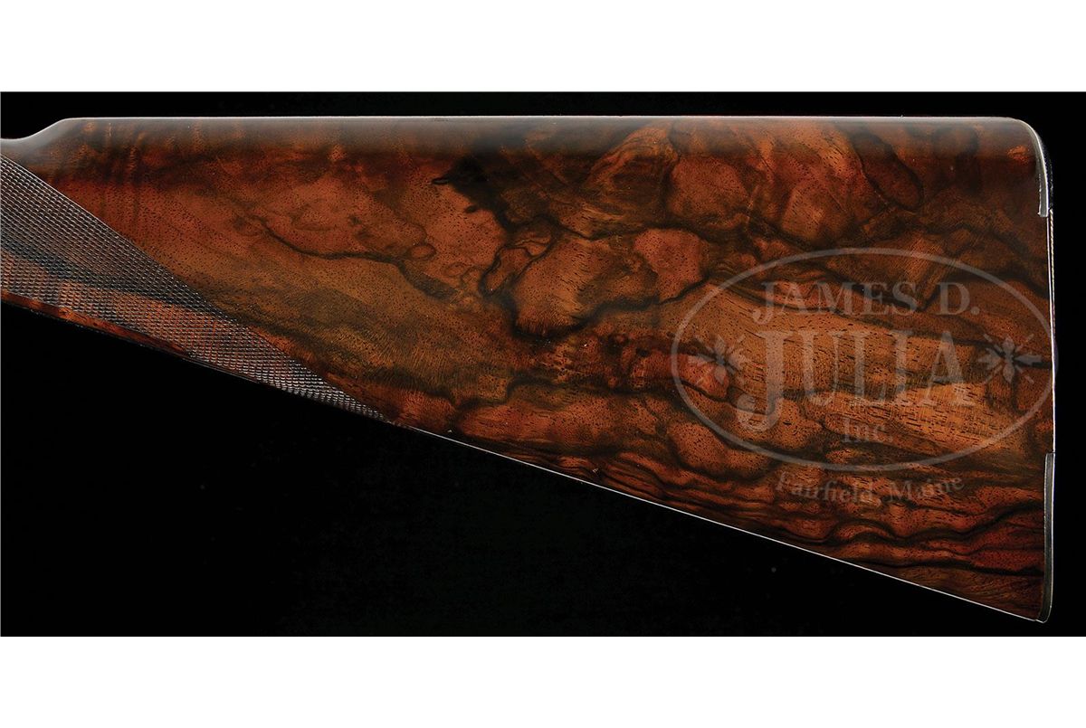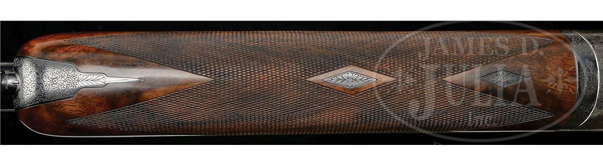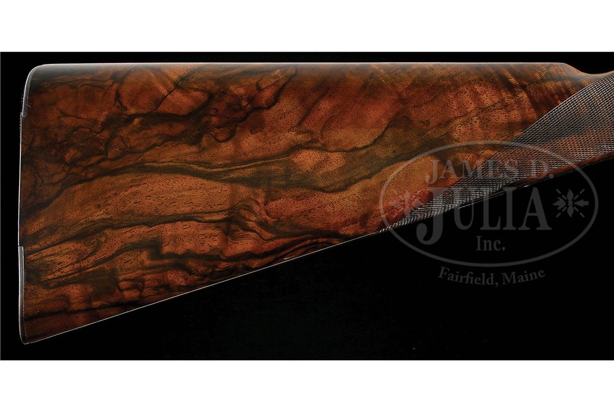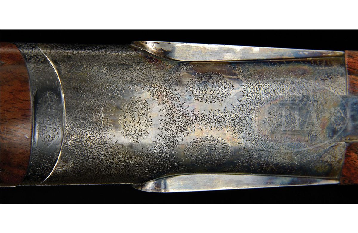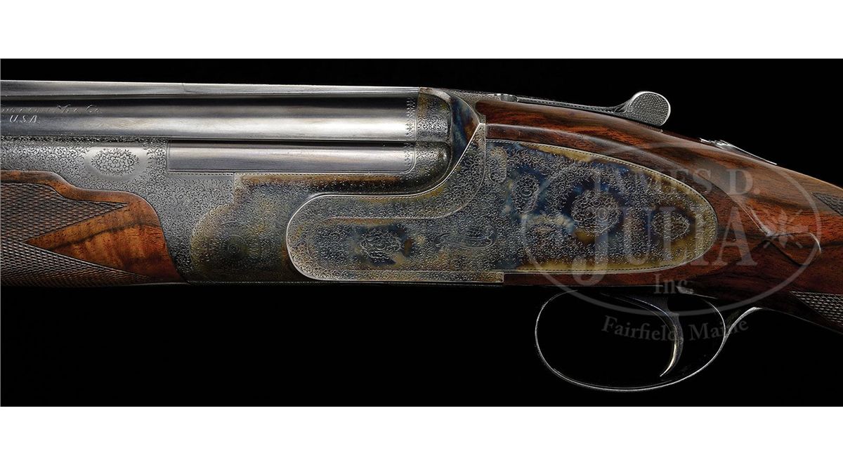 SN G113. Cal. 12 ga. 2-3/4" Chambers. This exceptional and innovative American made gun, embodying style and grace of the classic Boss O/U, has 28" demi-bloc bbls with raised, matted, solid rib engraved "A. Galazan" on top right, and "Connecticut Shotgun Mfg. Co" and "N. B. Ct. U. S. A." on left. Flat of bottom bbl is engraved with SN and gauge. Case hardened, low profile, full sidelock, O/U action features non-automatic safety, intercepting sears, and single non-selective trigger. It is fitted with Galazan's simplified and well engineered pinless sidelocks with single mounting screws, undetectable under small hinged covers, that blend almost perfectly with lockplates. Action is beautifully filed and polished, and engraved with classic hand cut small scroll with rose bouquet highlights in Boss style. "GALAZAN" is in scroll terminated riband on each lockplate. This fine engraving is by "Creative Art" with signature on trigger plate. Small bow beaded trigger guard is also scroll engraved, and has SN gold inlaid at grip. Exceptionally fine, intricately marbled, and nicely figured European walnut straight grip buttstock features drop points, as well as borderless point pattern checkering at grip, and measures 14-3/4" over checkered wood butt with engraved blued steel heel and toe plates. Matching Boss inspired ejector forend has Anson type release. Bore diameter: top -.729, bottom -.729. Bore restrictions: top -.036 (Full), bottom -.019 (Mod). Wall thickness: top-.024, bottom -.025. Drop at heel: 1-7/8", drop at comb: 1-7/16". Weight: 7 lbs. 7 oz. LOP: 14-3/4". Makers oak and leather case with brass corners and hardware and canvas leather trimmed outer cover, is lined in burgundy cloth with CSM gold embossed black leather label on lid. Case has oak trim on top of partitions, and contains a pair of Galazan marked snap caps. CONDITION: Excellent, showing evidence of very light field use, and retaining nearly all of its fine orig finish on wood and metal parts. Bbls are slightly silvered along rib. Action is slightly silvered on beads and sharp edges. Top lever thumbpiece is silvered. Blue on trigger guard tang is beginning to thin. There are numerous light marks and scratches in finish of wood, checkering darkened. Blue on heel and toe plates has moderate silvering and some marks. Bores are excellent. Action is tight. Ejectors are in time. Trigger works. Case leather is excellent, protected by its outer cover, which shows some minor scuffs. Zippers still work well. Interior cloth is excellent, as are label and accessories. Undoubtedly the finest gun made in America today, rivaling the best productions of England and Italy. 4-49106 MGM298
