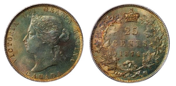 1874-H. PCGS graded Mint State-66. A rare Gem Victorian twenty-five cents piece. Medium to heavy iridescent toning. Exceptional ‘eye appeal’, as would be expected with a Gem..