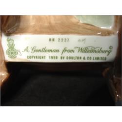 'A GENTLEMAN FROM WILLIAMSBURG' ROYAL DOULTON FIGURINE. Depicts seated Colonial gentleman. Marked on bottom "H.N. 2227-A Gentleman from Williamsburg-Copyright 1959 by Doulton & Co. Limited". 6" H