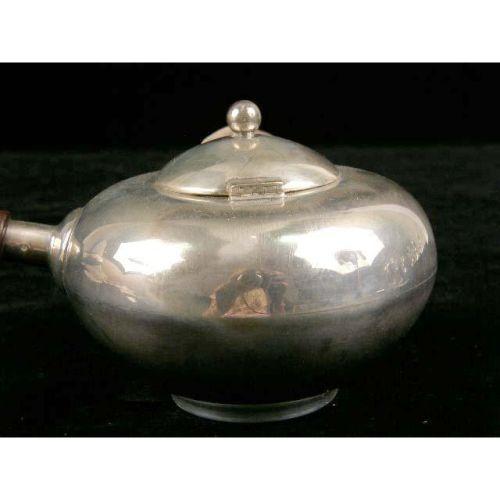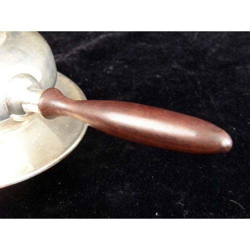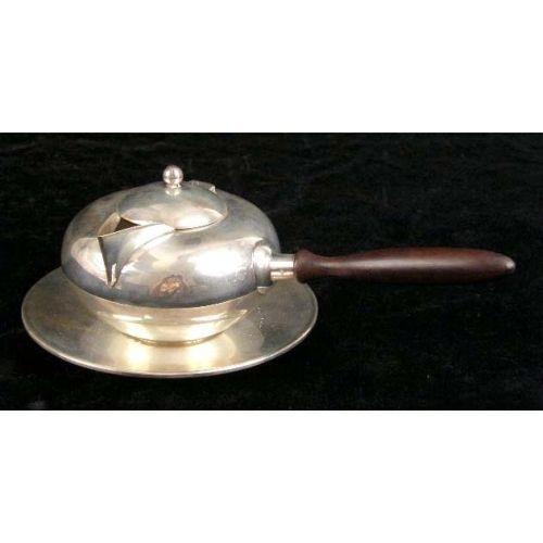 A GEORG JENSEN, USA, STERLING SILVER WOODEN HANDLED BRANDY WARMER WITH UNDERPLATE<BR><BR>8-3/4"long over handle, underplate 5-1/2"dia., total weight 11 T.O.