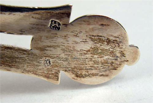 English, crested on each circular end to handle, of a crowned man`s profile, same crest on one handle underside, hallmarked, weight apx. 3 T.O. 11 1/2"l