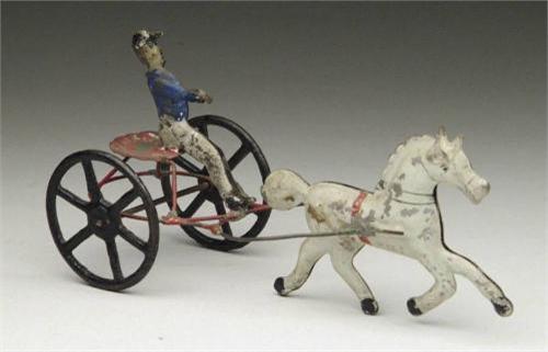A GEORGE BROWN EARLY AMERICAN TIN SULKY. A white horse pulling a sulky with two cast iron wheels. Sulky rider holds the reins. A very cute size toy. SIZE: 7" l x 3" w. CONDITION: Horse re-soldered to sulky. Some re-soldered to seat of sulky. Some paint loss to toy. Overall good condition. 1-5370 MC