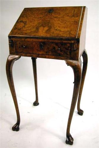 A GEORGE I STYLE WALNUT VENEERED LADIES' WRITING DESK; With divided interior, C-scrolled legs, and volute-carved trifid feet (repairs) 36"h x 18"w x 16"d