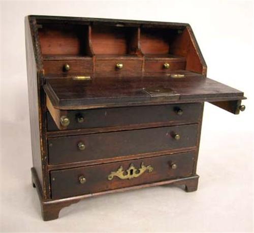 A GEORGE I WALNUT MINIATURE SLANT FRONT DESK; English, the interior with pigeonholes and short drawers, nice old surface (minor losses) 9 1/2"h x 9"w x 4 1/4"d