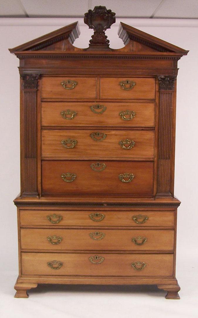 A GEORGE II CARVED AND FIGURED MAHOGANY CHEST ON CHEST SECRETAIRE