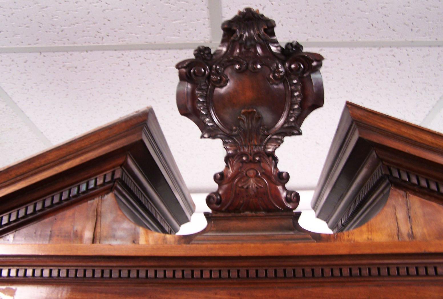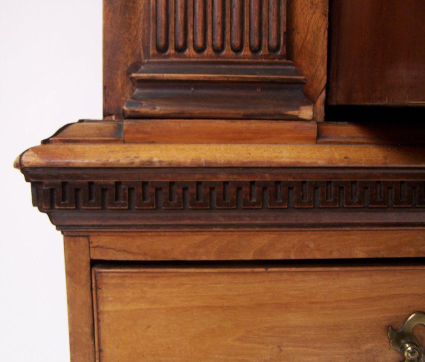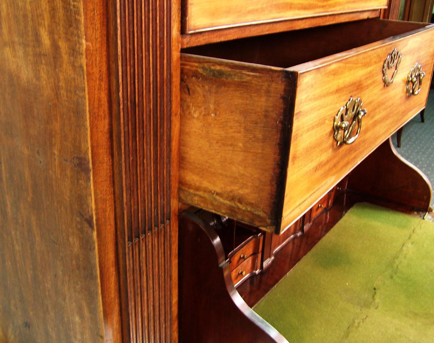 In two parts, the retractable bottom drawer in upper section opening to reveal a section of pigeonholes and short drawers, and a baize-lined writing surface, appears to retain its original openwork brass hardware and cartouche. 7`3"h x 4`2"w x 23"d
