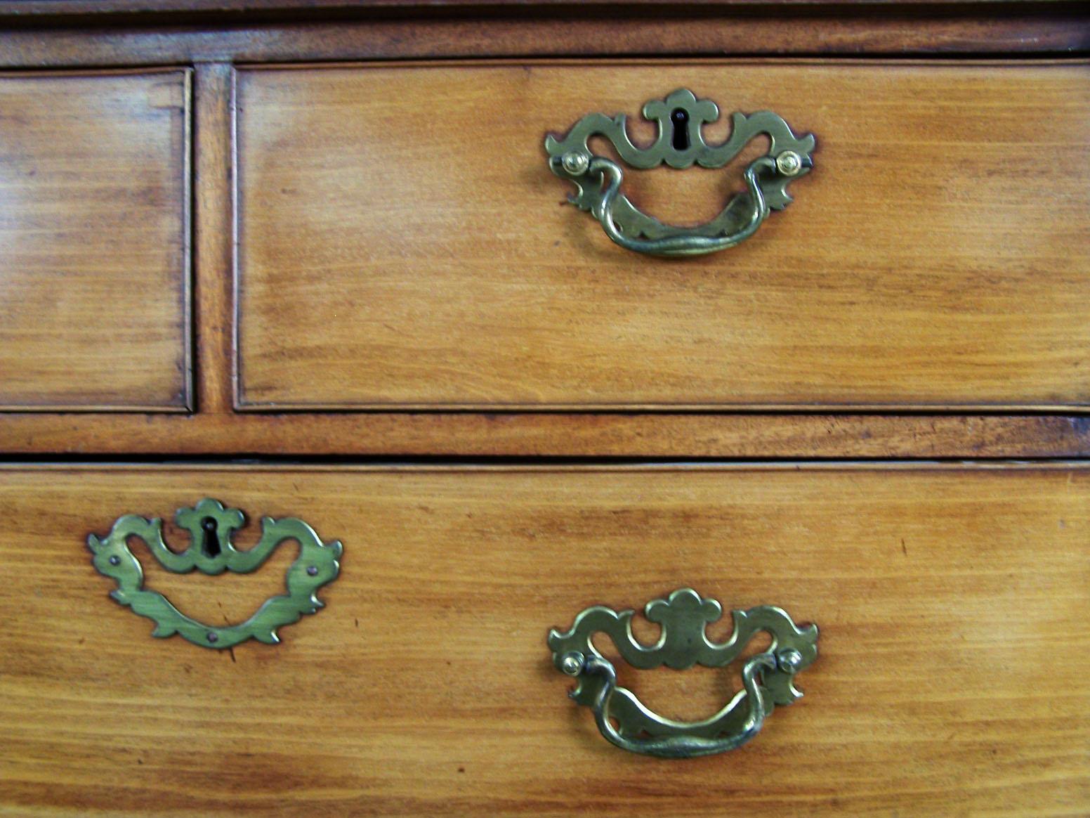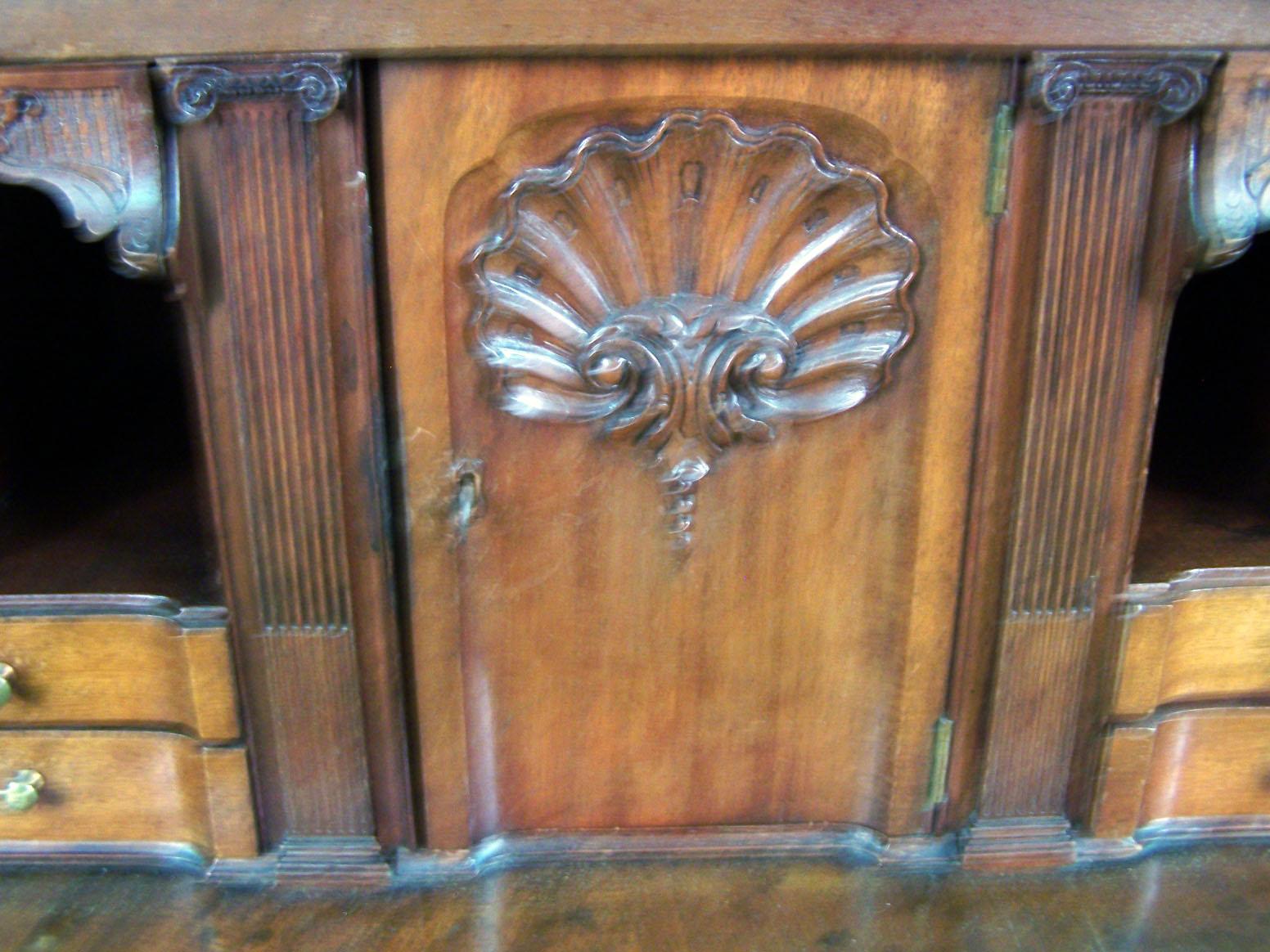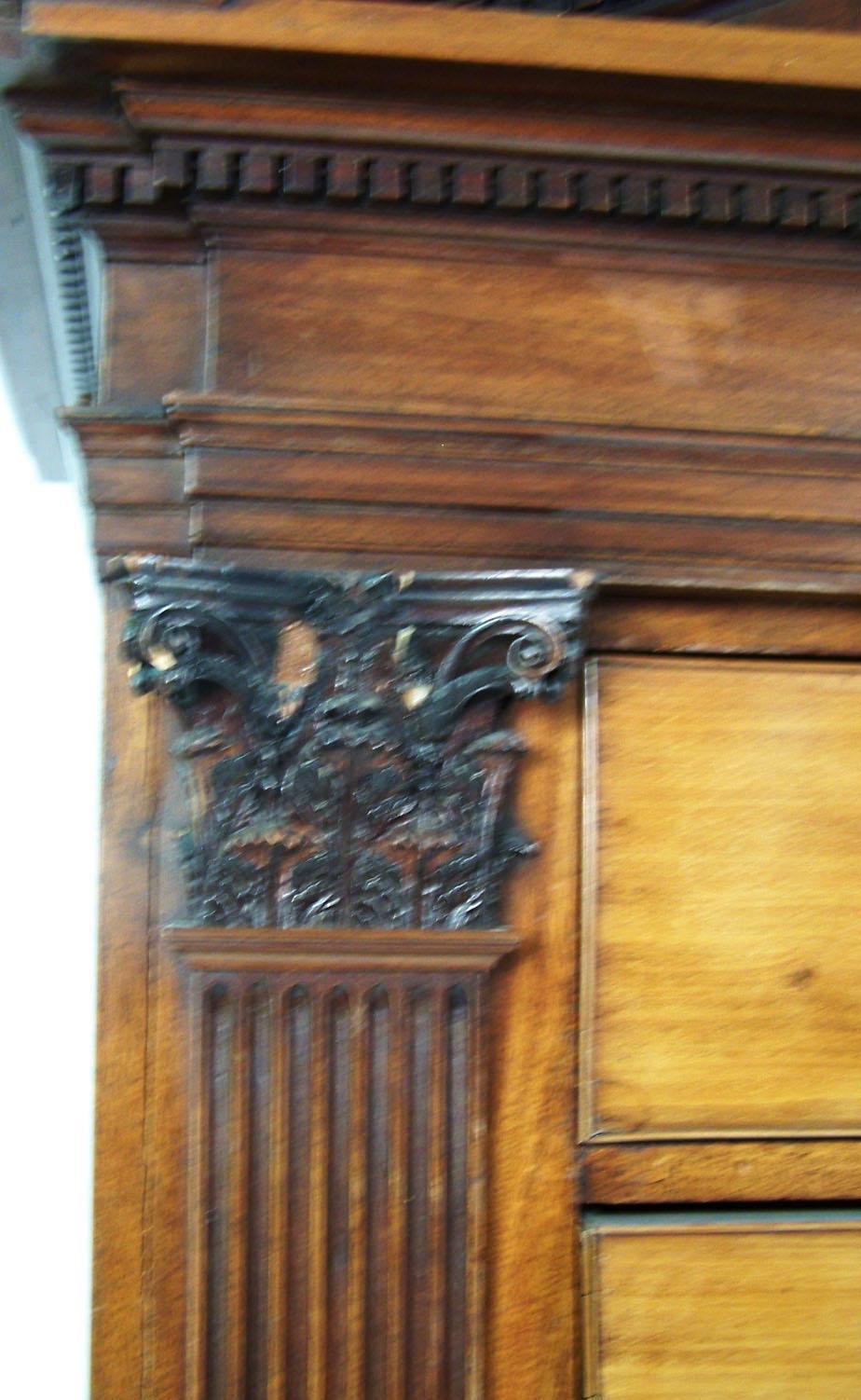 In two parts, the retractable bottom drawer in upper section opening to reveal a section of pigeonholes and short drawers, and a baize-lined writing surface, appears to retain its original openwork brass hardware and cartouche. 7`3"h x 4`2"w x 23"d