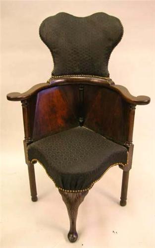 A GEORGE II CARVED WALNUT HIGH-BACK CORNER CHAIR; English, with a shaped crest above a concave arm with outscrolled terminals, the balloon seat on a frontal cabriole leg (various repairs)