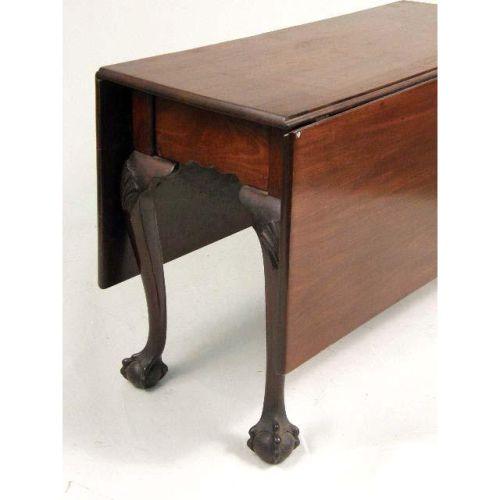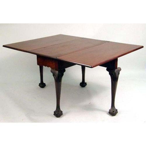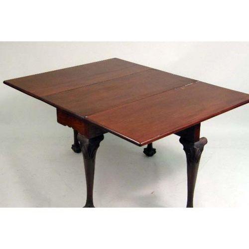 A GEORGE II SHELL-CARVED MAHOGANY DROP LEAF DINING TABLE<BR><BR>English, some repairs, 28-1/2"h x 41-1/2"w x 19"d
