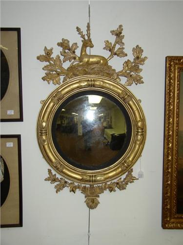 A GEORGE III CARVED GILTWOOD AND PART EBONIZED LOOKING GLASS; English, with stag, acorn, and oak leaf decoration (restored) 46"h x 27" diameter