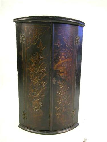 A GEORGE III CHINOISERIE-DECORATED HANGING CORNER CUPBOARD; English, with a molded cornice and three shelves, worn, 36"h x 22"w