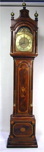 A GEORGE III INLAID AND FIGURED MAHOGANY BRASS- MOUNTED TALL CASE CLOCK WITH MUSICAL WORKS; English, the pagoda form bonnet surmounted by three brass finials, with an arched brass dial below, the urn decorated waist door below with a stepped base (works possible associated and some restorations) 8'5"h x 23"w x 11"d