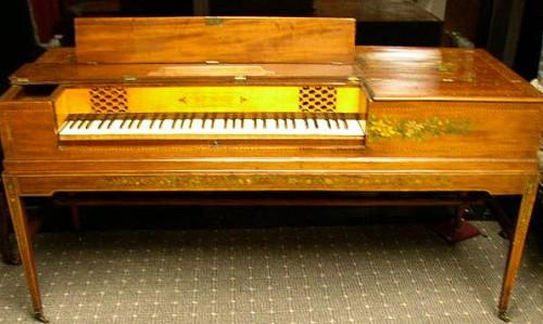 A GEORGE III INLAID AND PAINT DECORATED MAHOGANY PIANO-FORTE; Stenciled George Dettmet & Son, London, painted all over with flowers, urns and trailing vines, on square tapering legs and ending on casters 33"h x 5'6"w x 24"d