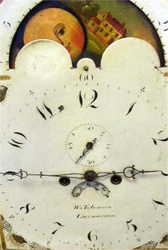 A GEORGE III INLAID CHERRYWOOD TALL CASE CLOCK; English, the swan's neck pediment surmounted by three finials, the white painted dial below with painted spindles and phases of the moon, the case with fluted quarter columns and continuing to a bracket base, bonnet door glass cracked (some restorations and repairs) 9'h x 21 1/2"w x 9 1/4"d