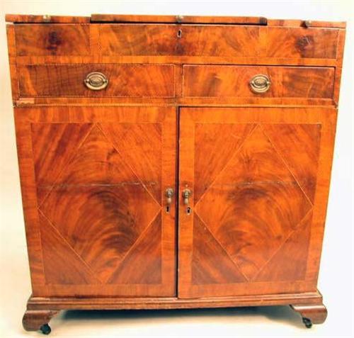 A GEORGE III INLAID MAHOGANY BEAU BRUMMEL; English, with hinged tri-partite top opening to a mirrored compartmentalized interior, above drawers and cupboard doors on ogee bracket feet (losses, repairs, feet reduced) 38 1/2"h x 36"w x 24"d