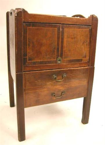 A GEORGE III INLAID MAHOGANY BEDSIDE CUPBOARD; English, with three-quarter gallery, overhead door and retractable base, previously fitted with a commode (alterations) 32"h x 21"w x 19"d