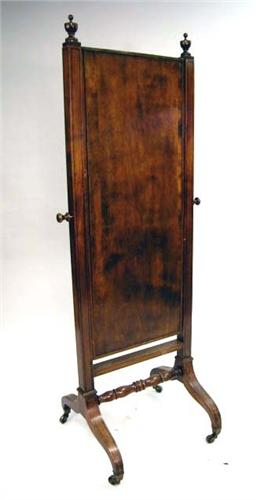 A GEORGE III INLAID MAHOGANY CHEVAL GLASS; English, with urn finials, turned stretcher, and casters (some wear) 5'4"h x 24"w
