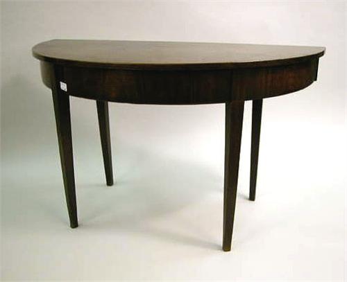 A GEORGE III INLAID MAHOGANY DEMI-LUNE TABLE; English, formerly part of a dining table (restored and imperfections to surface) 27 1/2"h x 4'w x 23 1/2"d