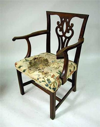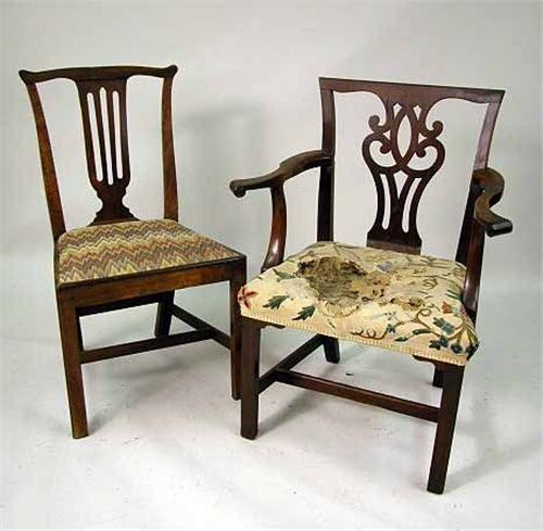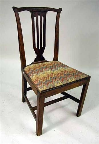 English. Repairs and wear. 37"h. Together with a George III fruitwood side chair. Distressed. 38"h. 2 pieces.