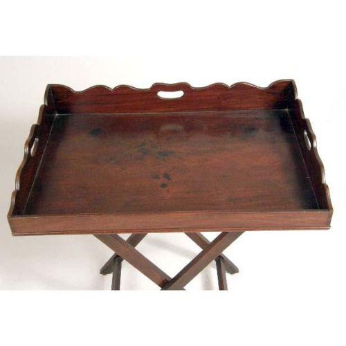 A GEORGE III MAHOGANY BUTLER`S TRAY ON FOLDING STAND<BR><BR>English, stand of a later date, 35"h x 30"w x 20-1/2"d