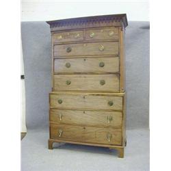 A GEORGE III MAHOGANY CHEST ON CHEST, arcaded ogee cornice, canted corners inlaid with satin and kingswood, shaped bracket feet, height 195cm, width 115cm £600-800