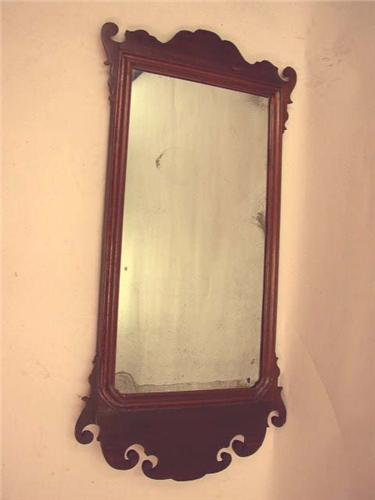 A GEORGE III MAHOGANY MIRROR LABELLED BY JOHN ELLIOT, PHILADELPHIA; English, the bilingual label describes his business on Walnut Street with other contemporary newspaper remnants, some repairs, 36"h x 18"w