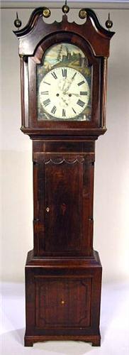 A GEORGE III MAHOGANY TALL CASE CLOCK; Bonnet with scrolled molded pediment, brass finials and arched glazed door opening to a white face painted with rural waterway scene above a circular dial, the waisted case with shell inlaid door and fluted quarter columns, resting on bracket feet, 7'6"h