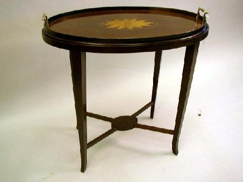 A GEORGE III SATINWOOD-INLAID MAHOGANY TRAY; English, with a central floral medallion and brass handles on a later stand with cross stretchers and flared feet 28"h x 28"w x 20"d