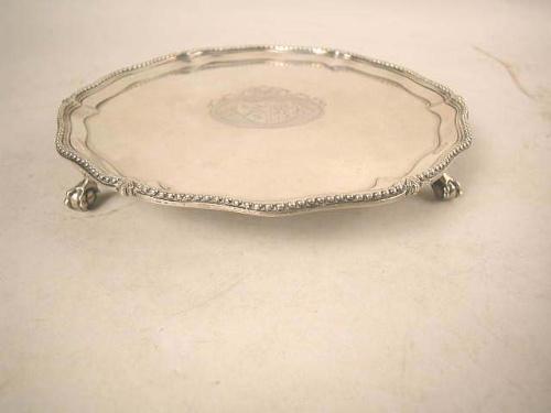 A GEORGE III SILVER SALVER; Hallmarked London, possibly maker Richard Rugg, engraved shield crest 8"diameter, apx. 13 T.O.