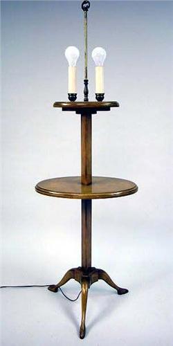 A GEORGE III STYLE BEECHWOOD DUMBWAITER LAMP; With two lights surmounting two graduated oval shelves on a triangular support and ending on downswept legs 4'6"h x 17 1/2"w x 12"d