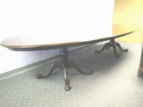 A GEORGE III STYLE CARVED AND INLAID MAHOGANY TWO-PEDESTAL OVAL CONFERENCE TABLE; The line-inlaid oval top above two baluster form standards continuing to foliate-carved downswept legs ending in claw-and-ball feet, wear, abrasions, and imperfections to su