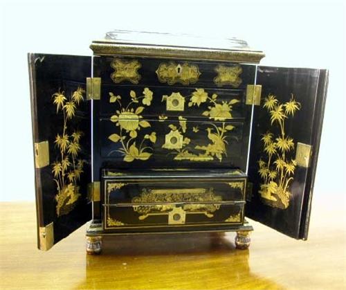A GEORGE III STYLE CHINOISERIE DECORATED JEWELRY CABINET; with hinged lid above drawers. 16"h