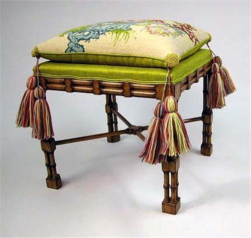 A GEORGE III STYLE FAUX BAMBOO AND NEEDLEWORK UPHOLSTERED STOOL; The rectangular seat with chinoiserie-decorated needlework squab above a conforming block-and-faux bamboo frieze supported on similarly decorated clustered legs joined by an x-form stretcher, 22"h x 20"w x 20"dia.