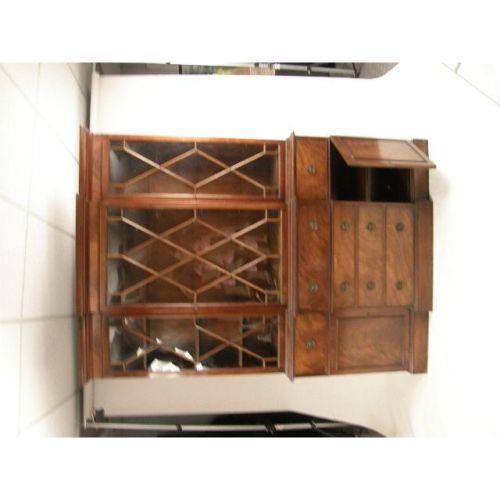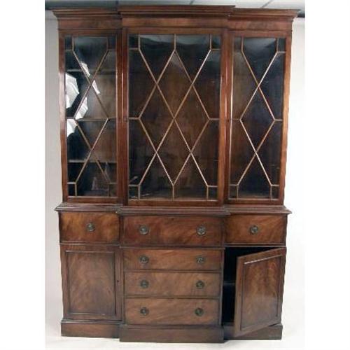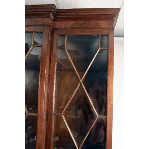 A GEORGE III STYLE FIGURED MAHOGANY BREAKFRONT BOOKCASE<BR><BR>in two pieces, with original key. Top stamped "42", bottom "11". Reverse with scattered splashes of white paint. 105 1/4" h x 57 1/4" w x 15 1/4" d.