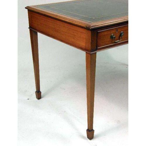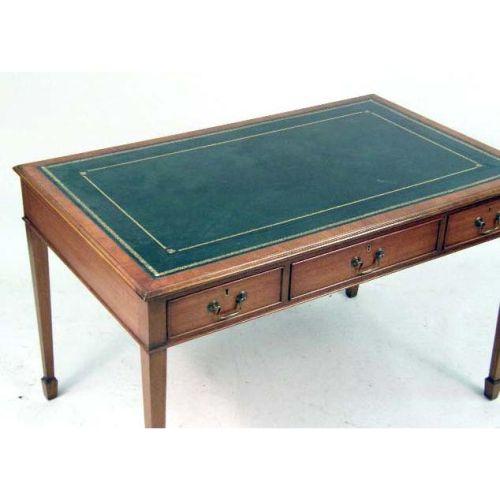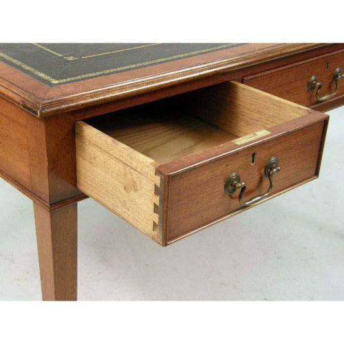 A GEORGE III STYLE GREEN LEATHER-TOPPED "PARTNER`S DESK"<BR><BR>one side with faux drawers. Having keys for the real drawers. 30" h x 48 1/4" l x 29 1/2" d.