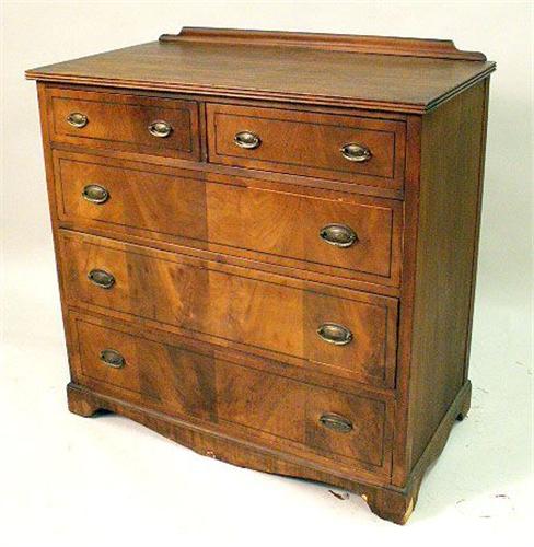 The rectangular reeded top with shaped backsplash above two short draws and three long drawers, the shaped apron below on a bracket base. Losses to veneer and inlay. 38 1/2"h x 38"w x 20 1/2"d.
