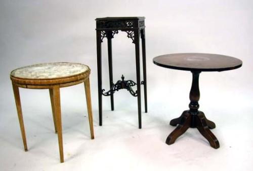 A GEORGE III STYLE MAHOGANY KETTLESTAND; Together with a shell-decorated oak low table and a mahoganized example (losses, stains)