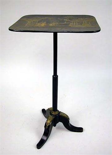 A GEORGE III STYLE ORMOLU-MOUNTED BLACK-LACQUER CANDLESTAND; Rectangular top on turned standard and downswept legs 27"h x 15"w x 12"d