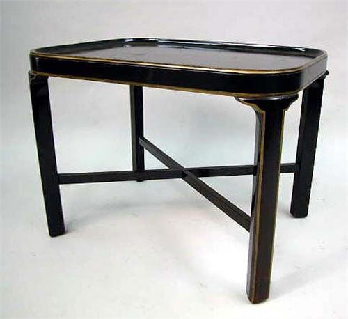 A GEORGE III STYLE PARCEL-GILT BROWN LACQUER SIDE TABLE; the dish top with rounded corners on square legs joined by stretchers, 18 1/2"h x 25"w x 19"d